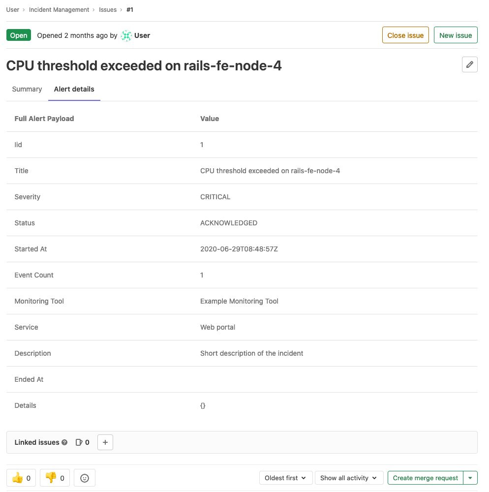 • Date created: How long ago the incident was created. This field uses the standard GitLab pattern of X time ago. Hover over this value to see the exact date and time formatted according to your locale.